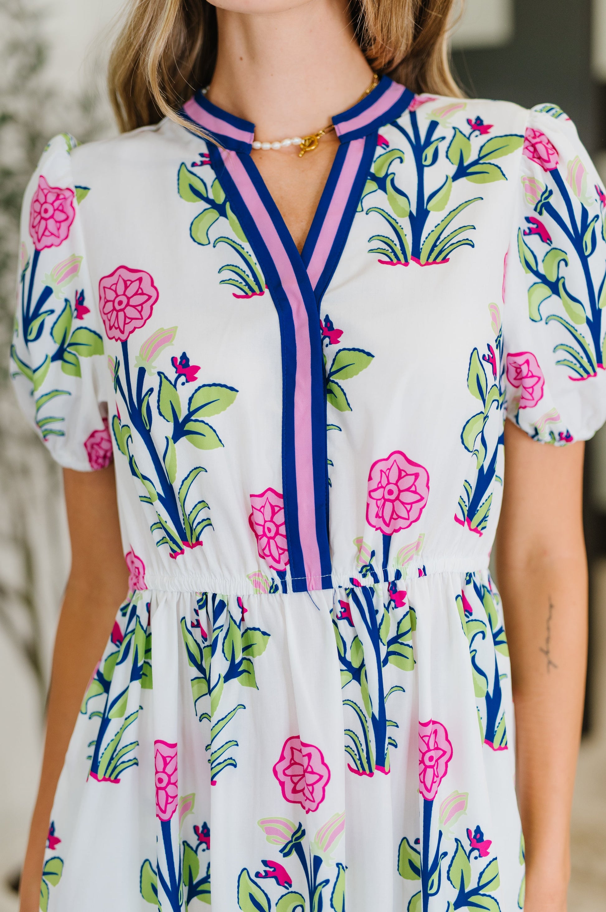 Bring playful hippie vibes to your wardrobe with this floral print Boho V-Neck Balloon Sleeve Dress. Crafted from crisp poplin woven fabric, it features a contrast banded V-neckline and snap button closure for easy style. Balloon sleeves with cased elastic cuffs add volume, while the elastic waistband and gathered tier create a flattering, flowy silhouette. Functional side pockets complete this fun and effortless look perfect for any sunny day adventure.