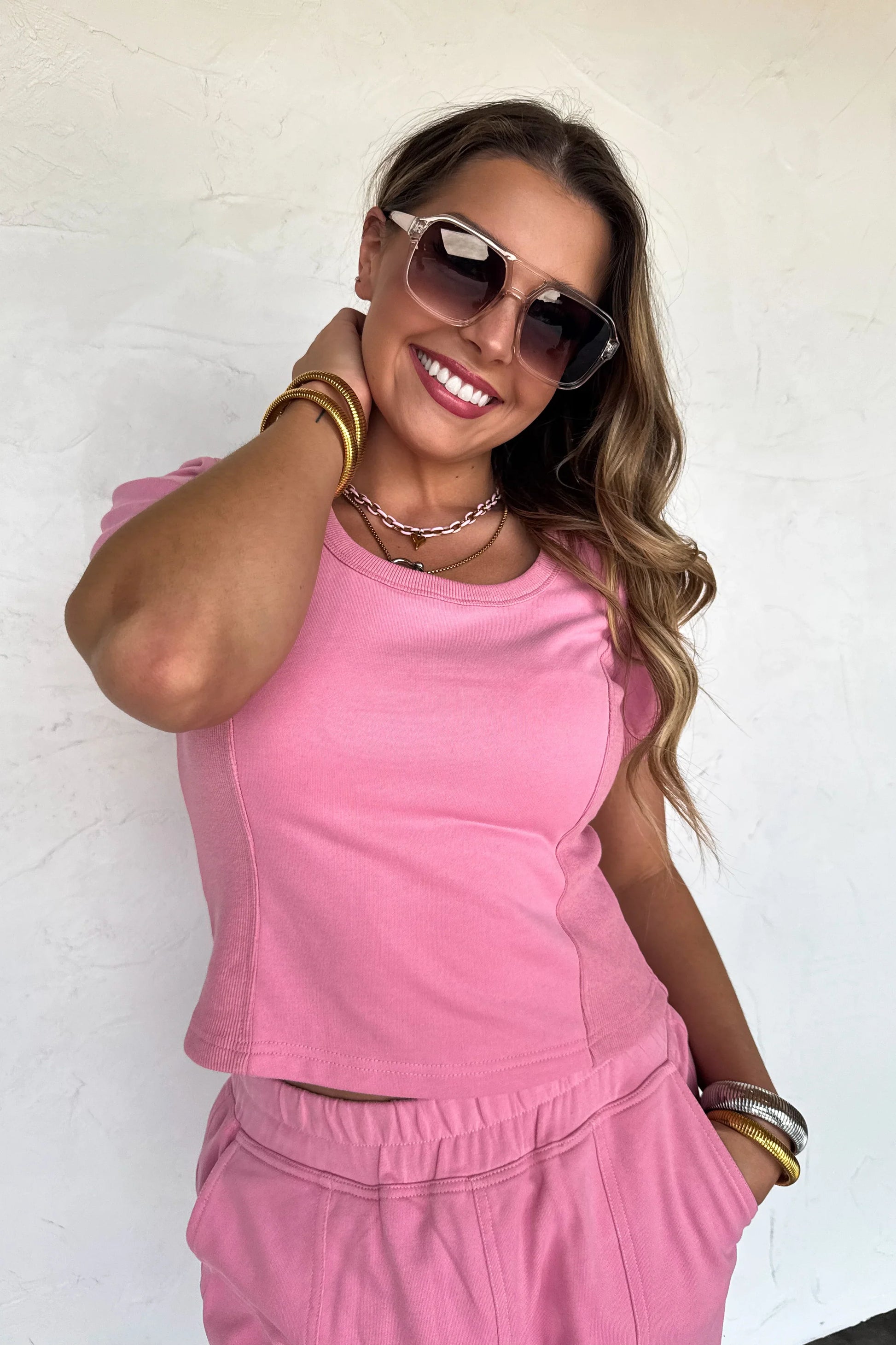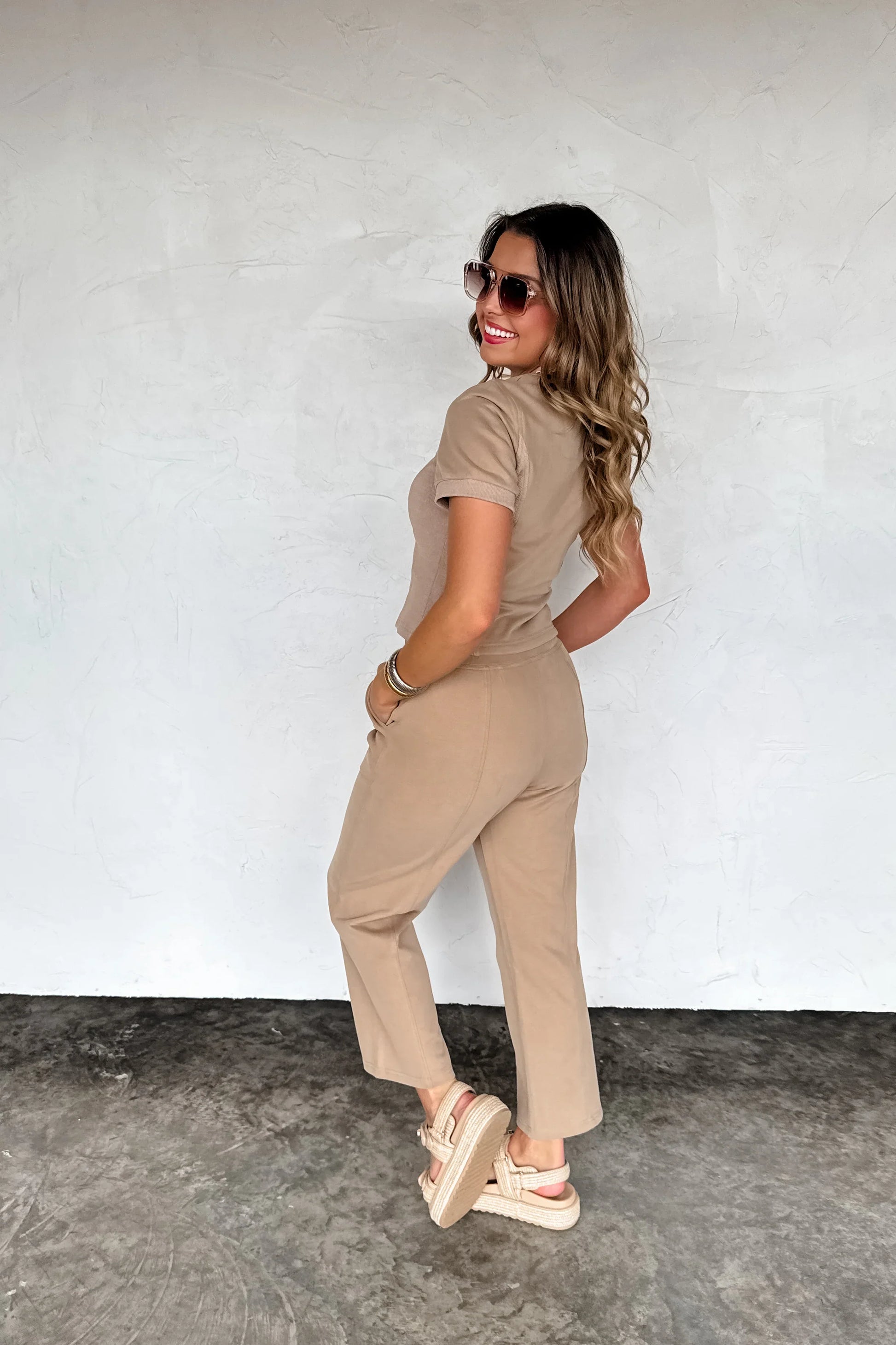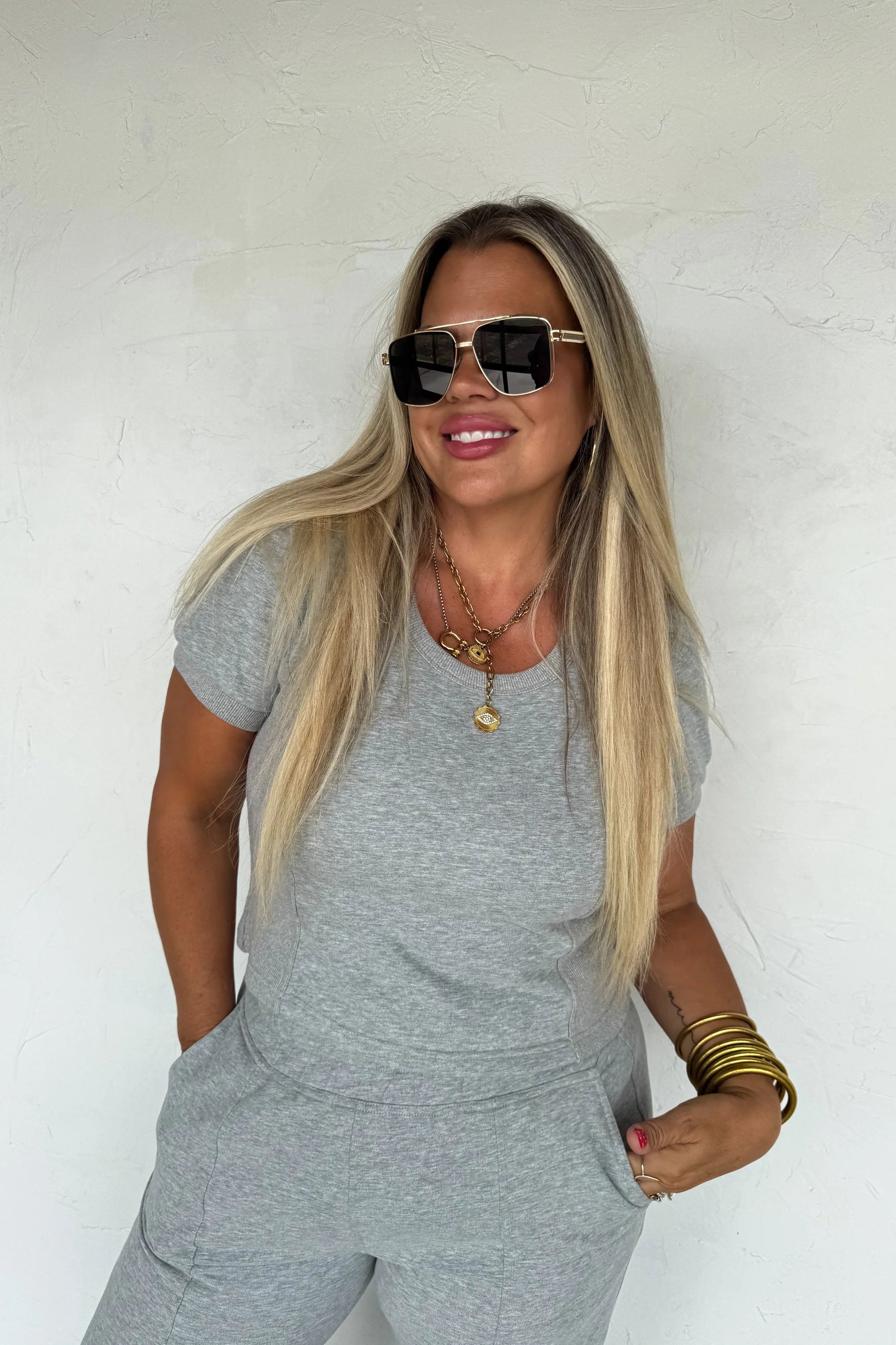 A casual two-piece set featuring a short sleeve top with seam detailing and matching straight-leg pants with an elastic waistband and side pockets. Made from soft, stretchy cotton-blend fabric for all-day comfort. Perfect for lounging or everyday wear.