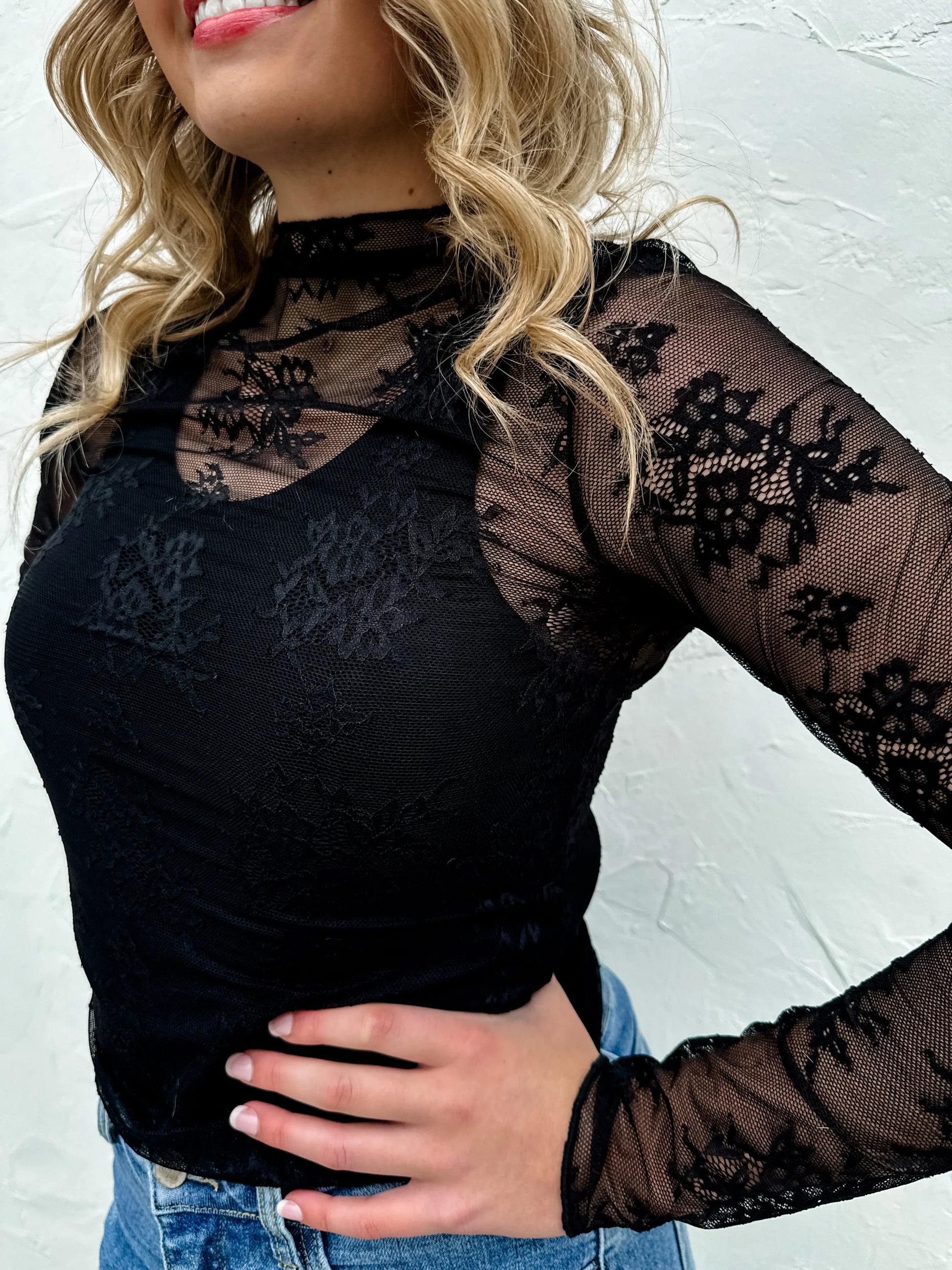 Super cute for layering, this sultry stretchy lacey mesh long-sleeve top features a totally sheer design with floral embroidery. Dainty mock neck and thumbhole details. Relaxed fit with a fluttery hemline.